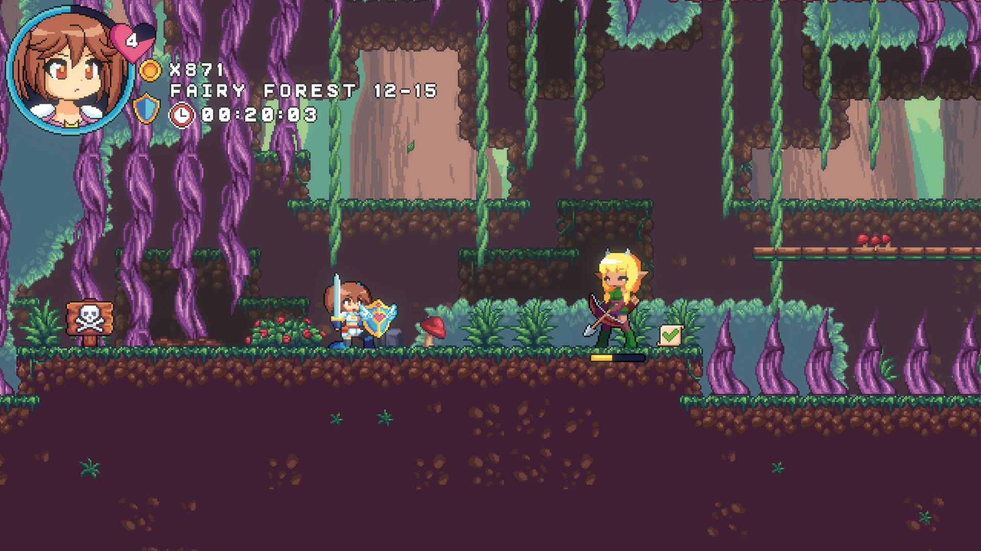 Ihr zieht mit der zornigen Ehefrau durch ein halbes Dutzend bunter und abwechslungsreicher Pixel-Welten, die nicht zuletzt Erinnerungen an Wonder Boy-Spiele aufkommen lassen. Mia ist mit einer satten Portion Sprungkraft gesegnet und hat dem Umgang mit ihrem Schwert nicht verlernt. Entsprechend rennt und hüpft Ihr und schnetzelt Euch in klassischer 2D-Jump’n’Run-Manier voran.