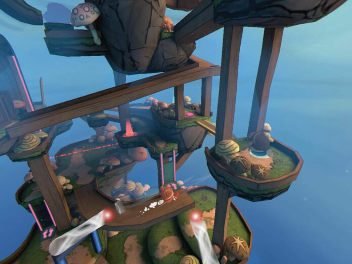 Ein wenig weckt dieses Spiel Erinnerungen an das VR-Vorzeige-Abenteuer Moss: So überzeugt auch hier die liebevolle und detaillierte Grafik rundum und Ihr agiert als schützende Kraft für die Protagonisten. Während Mäuseheldin Quill aber agil ist und auch gesteuert werden kann, nehmt Ihr bei Wind Wind fast nur indirekt Einfluss auf die beiden Charaktere. Von alleine bewegen sich Koji und Joe nämlich gar nicht – dafür müsst Ihr sie mit kurzen oder dauerhaften Windstößen Eurer quasi als Ventilator dienenden Move-Controller anschieben. Nur ihre jeweiligen Spezialfähigkeiten werden – so sie nicht passiv sind – auf Tastendruck ausgelöst: Er kann etwa Lasersperren schadlos blockieren und Kisten zertrümmern, sie wiederum springt über Abgründe. Allerdings müsst Ihr dafür genau den Winkel und die Kraft festlegen, was sich in den meisten Situationen als nervenaufreibende Aktion entpuppt, da schon minimale Fehler fatale Folgen haben können.