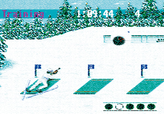 Die alpinen Sportarten sind mit Slalom, Abfahrt, Super-G und Riesenslalom vertreten dazu gesellt sich das Trickski-Buckelpisten-Rennen. Und siehe da: Hier haben wir einen Unterschied entdeckt. Der einzige Wettbewerb, der auf dem Mega Drive zu zweit gleichzeitig gespielt werden durfte, ist auf dem Super NES nur solo zu bewältigen. Habt Ihr Euch von diesem Schreck erholt, folgen die Disziplinen Rodeln und Bobfahren (optisch identisch dargeboten), Biathlon und Skispringen sowie der Eisschnellauf.