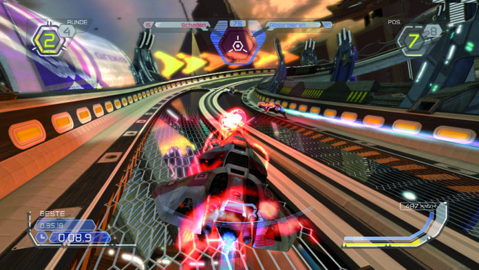 Gut gerüstet stellt Ihr Euch also der Kampagne in acht Klassen, die sich in verschiedene Events unterteilen: Wipeout-typisch rast Ihr in Einzelrennen oder Turnieren gegen sieben Mitstreiter. Aktiviert Waffensysteme, indem Ihr über entsprechende Felder auf der Strecke rast. So malträtiert Ihr Gegner mit Minen, Raketen, Plasma oder Erdbeben. Alternativ absorbiert Ihr Waffenextras in Schildenergie. Bei den Zeitrennen und Schnellen Runden habt Ihr die verschlungenen Pisten für Euch allein, knackige Zeitvorgaben halten Euch in Atem. In der Rennbox erstellt Ihr eigene Rennevents samt abschaltbaren Waffen. Löblich: Sogar an Splitscreen-Duelle an einem Bildschirm wurde gedacht. Ein grafisches Highlight erwartet Euch bei der ’Zone’: Hier erstrahlt die Strecke in wilden Farbkombinationen, während Euer Gleiter zu treibenden Beats immer weiter beschleunigt. Die Ohren werden von Kraftwerk, Booka Shade und Noisia verwöhnt. Eigene Soundtracks lassen sich ebenso einspielen. Gerade mit Kopfhörern und aktivierten Soundverfremdungen offenbart sich eine wunderbare Klangwelt.