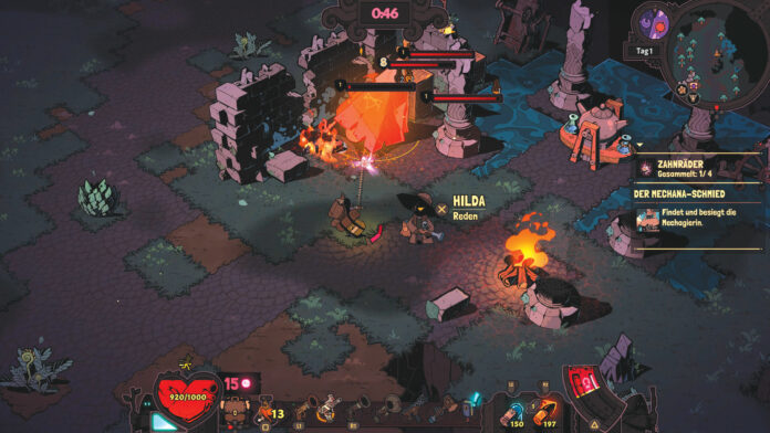 Obwohl der Devolver-Titel als Survival-Spiel mit Zauberern vermarket wird und optisch an Kleis Indie-Hit Don’t Starve erinnert, handelt es sich hier doch eher um ein Roguelite-Baller-Abenteuer mit einer gehörigen Portion Crafting, ähnlich kleinen Indie-Perlen wie Forager und Nova Lands.
