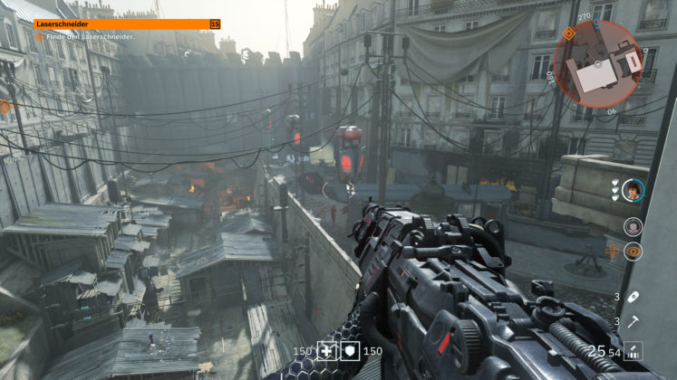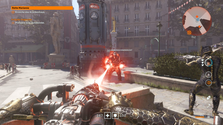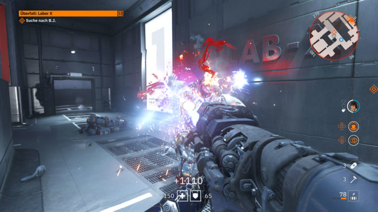 Seine ganzen Spaß entfaltet das Spiel aber erst im Zwei-Spieler-Koop-Modus. Dieser ist ausschließlich online verfügbar. Einen Splitscreen-Modus gibt es nicht. In seinem Spielfluss erinnert „Wolfenstein: Youngblood“ stärker an offene Online-Titel wie „The Division 2“. Gemeinsam pflügt ihr förmlich durch die Missionen, ballert Regime-Schergen über den Haufen und absolviert eine Aufgabe nach der anderen. Der Spielfluss profitiert von dem offeneren Design und MachineGames löst die Interaktion der Koop-Partner durch einige clevere Mechanismen.