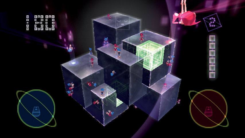 You, Me, and the Cubes ist das erste Spiel seit zehn Jahren von Kenji Eno, dessen frühere Firma Warp u.a. die D-Horror-Abenteuer oder Enemy Zero verantwortete. Als Grund für sein Comeback nennt der exzentrische Entwickler die Möglichkeiten der Wii-Controller, die hier reichhaltig eingesetzt werden, dem Spielspaß aber eher abträglich sind. Eure Aufgabe ist es, auf im freien Raum stehende Würfel-Konstrukte jeweils ein Paar Purzl-Figürchen zu werfen, ohne dass das Gleichgewicht verloren geht. Das ist anfangs noch simpel, wird aber rasant knifflig, weil stets neue Würfel erscheinen, die auch mal spezielle Störwirkungen haben, oder fiese Sonderfiguren, die andere Kerlchen herunterschubsen.