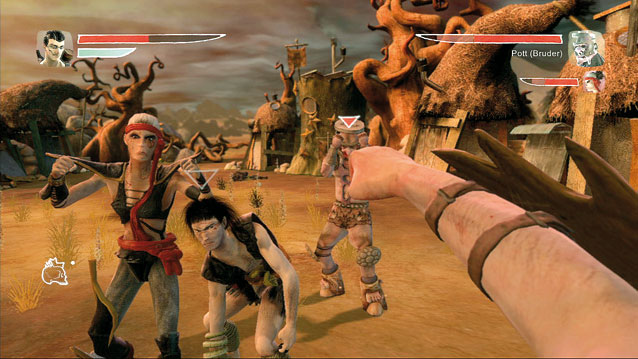 In Zeno Clash stecken Euch die Entwickler in die Haut des Ausgestoßenen Ghat er hat Vater-Mutter, das allmächtige Oberhaupt seines Clans, hinterrücks erschlagen, jetzt beginnt die Hetzjagd auf ihn. Zusammen mit seiner Begleiterin Deadra türmt Ghat aus der Stadt Halstedom, flieht durch von gruseligen Chimären und bizarren Tiergestalten bevölkerte Wälder und Wüsten bis ans Ende der Welt. Was ihn dort erwartet, müsst Ihr schon selbst herausfinden wir versprechen Euch eine einprägsame Erfahrung, einen Farbenrausch und ein mystisches Überwesen, das gerne mit Rubiks Zauberwürfel spielt. Spielerisch erwartet Euch das oftmals fesselnde, mitunter aber auch hektisch-stressige Korsett eines Ego-Abenteuers, in dem Ihr mehr Fausthiebe verteilt als Waffen abfeuert.