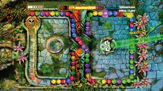 Für eine Fortsetzung zu einem fast zehn Jahre alten Spiel hat sich bei Zuma’s Revenge bemerkenswert wenig geändert – doch das ist gut so. Wie beim 2003 erschienenen Erstling (der sich kräftig beim japanischen Automaten Puzzloop bediente) spuckt Euer Froschgötze in alle Richtungen farbige Kugeln auf eine unaufhaltsam rollende Kette. Treffen so mindestens drei gleiche Murmeln zusammen, verschwinden sie. Das ist so simpel wie motivierend und wird durch behutsam eingesetzte Neuerungen wie mehr Sonderkugeln oder Positionswechsel Eures Spuckers gelungen erweitert. Die Aufteilung in 60 einzelne Levels reduziert zudem Frustgefühle, nur bei den ebenfalls neuen Endgegner-Duellen spielt das Glück hin und wieder eine größere Rolle.